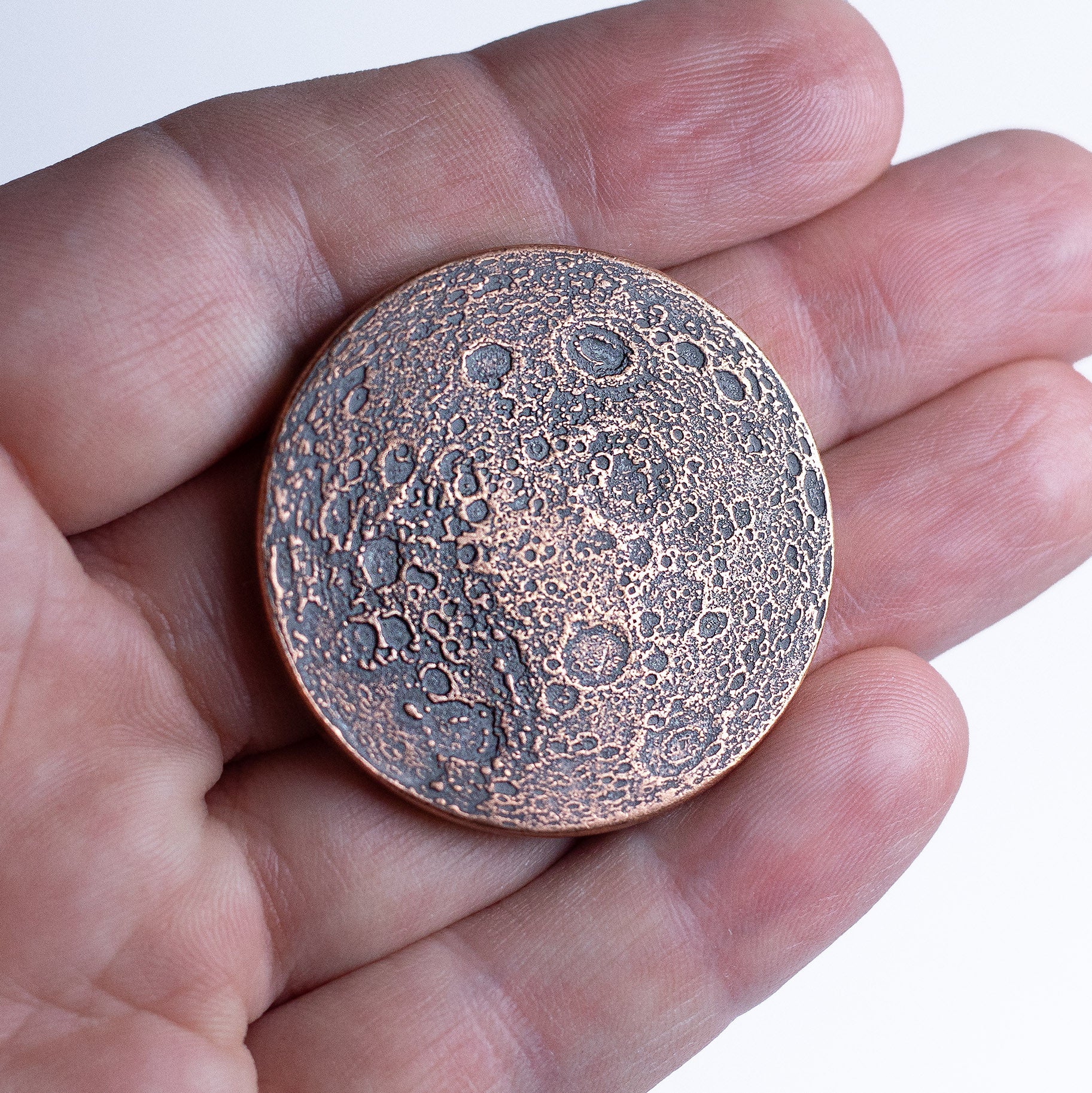 This coin of Earth's Moon features a geographically (technically it's selenographically) correct 136,794,240:1 scale design of the surface texture of both its near and far side. A great worry coin, gift, or reminder coin.