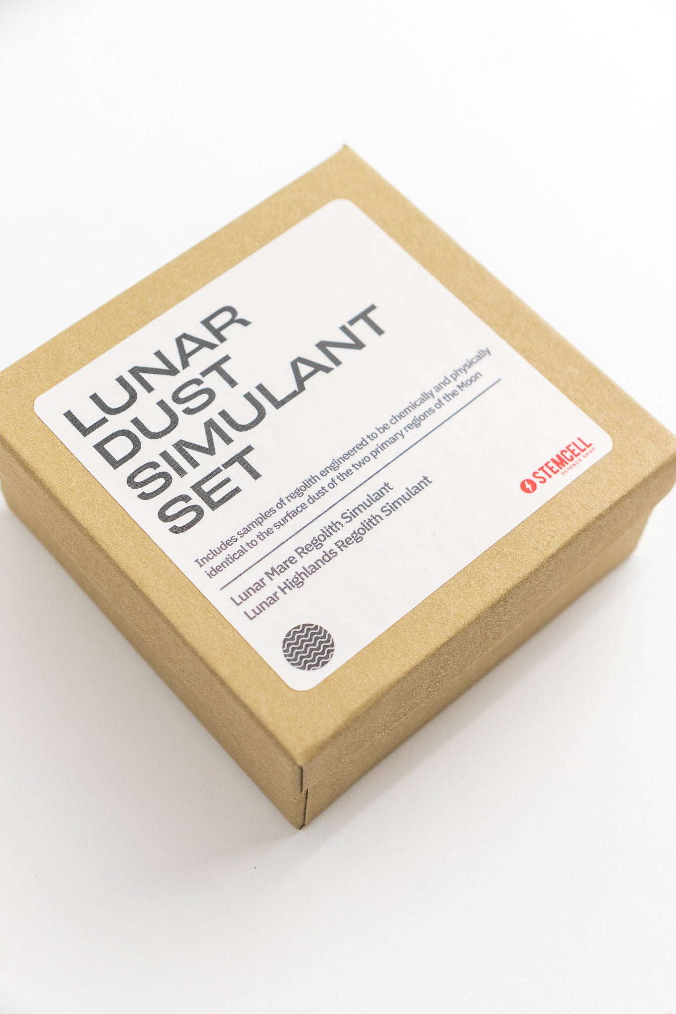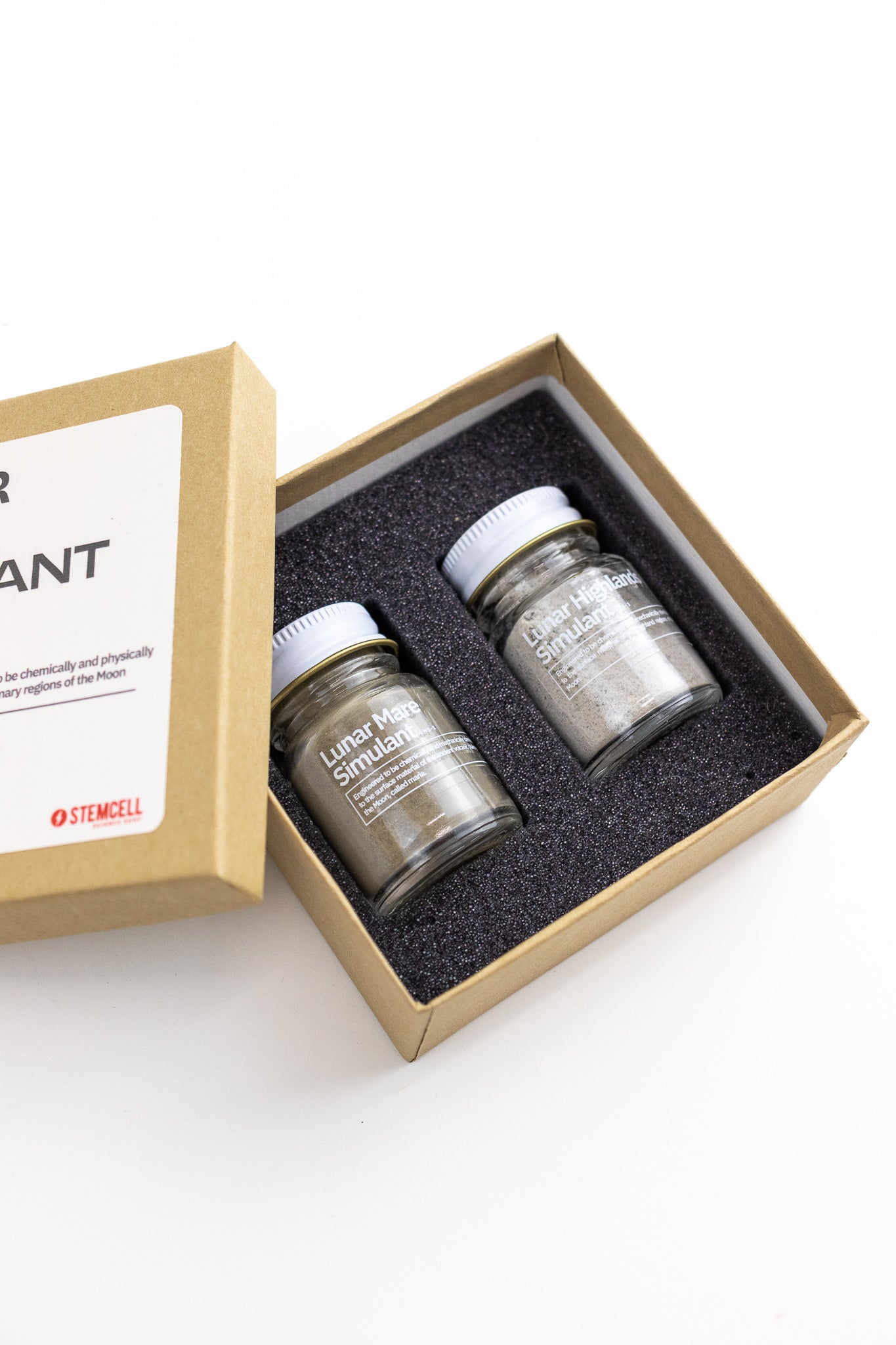 This box includes two samples of regolith engineered to be chemically and physically identical to the surface dust of the two primary regions of the Moon.