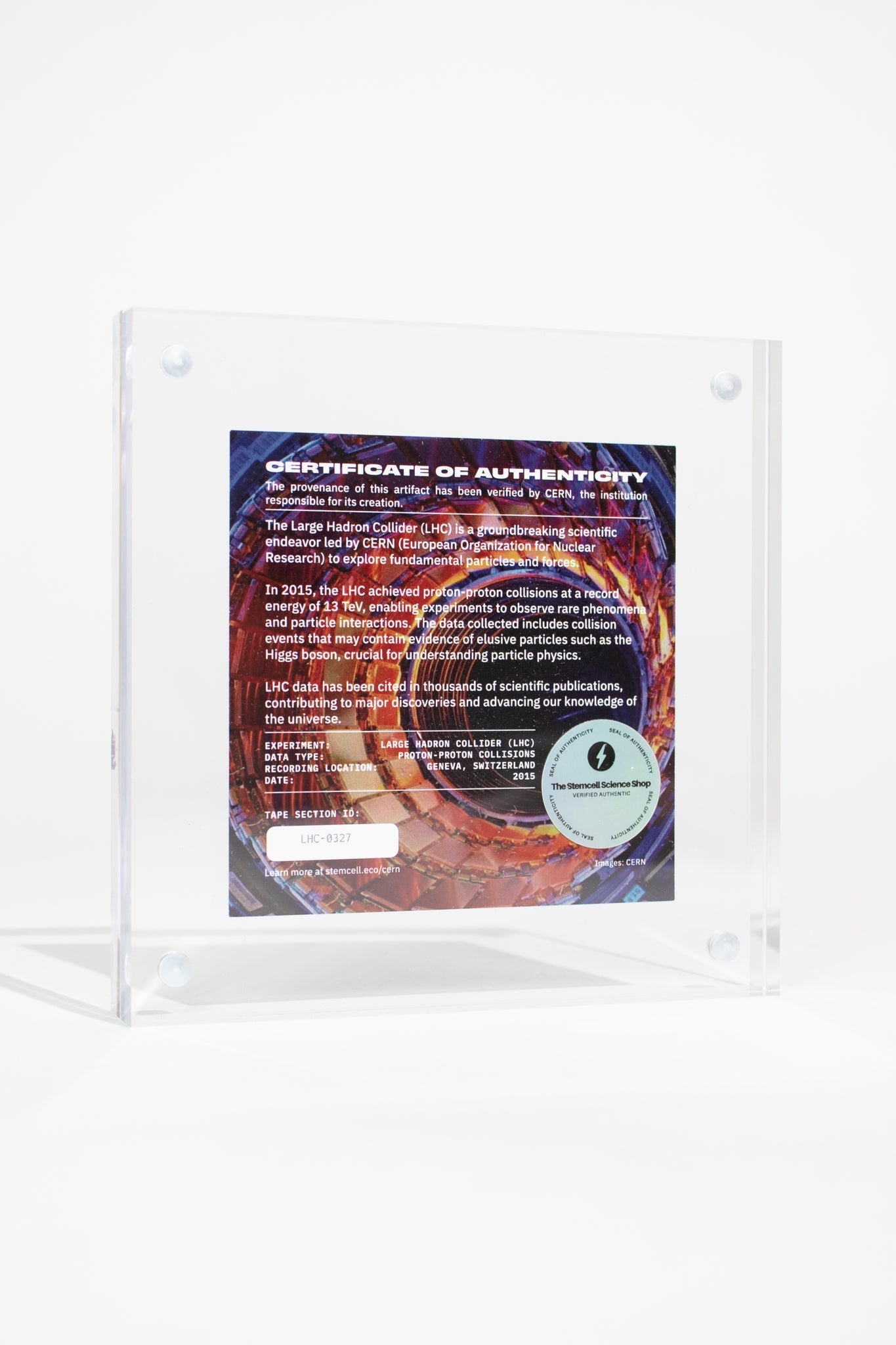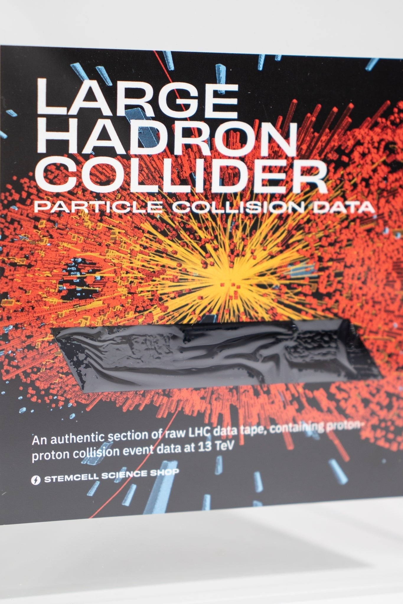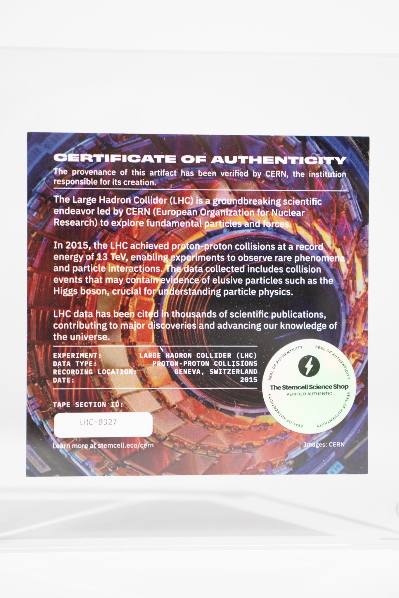 This section of data tape, created by CERN, contains a record of particle interactions and decay patterns observed during these high-energy collisions. Researchers use this data to explore phenomena such as:
