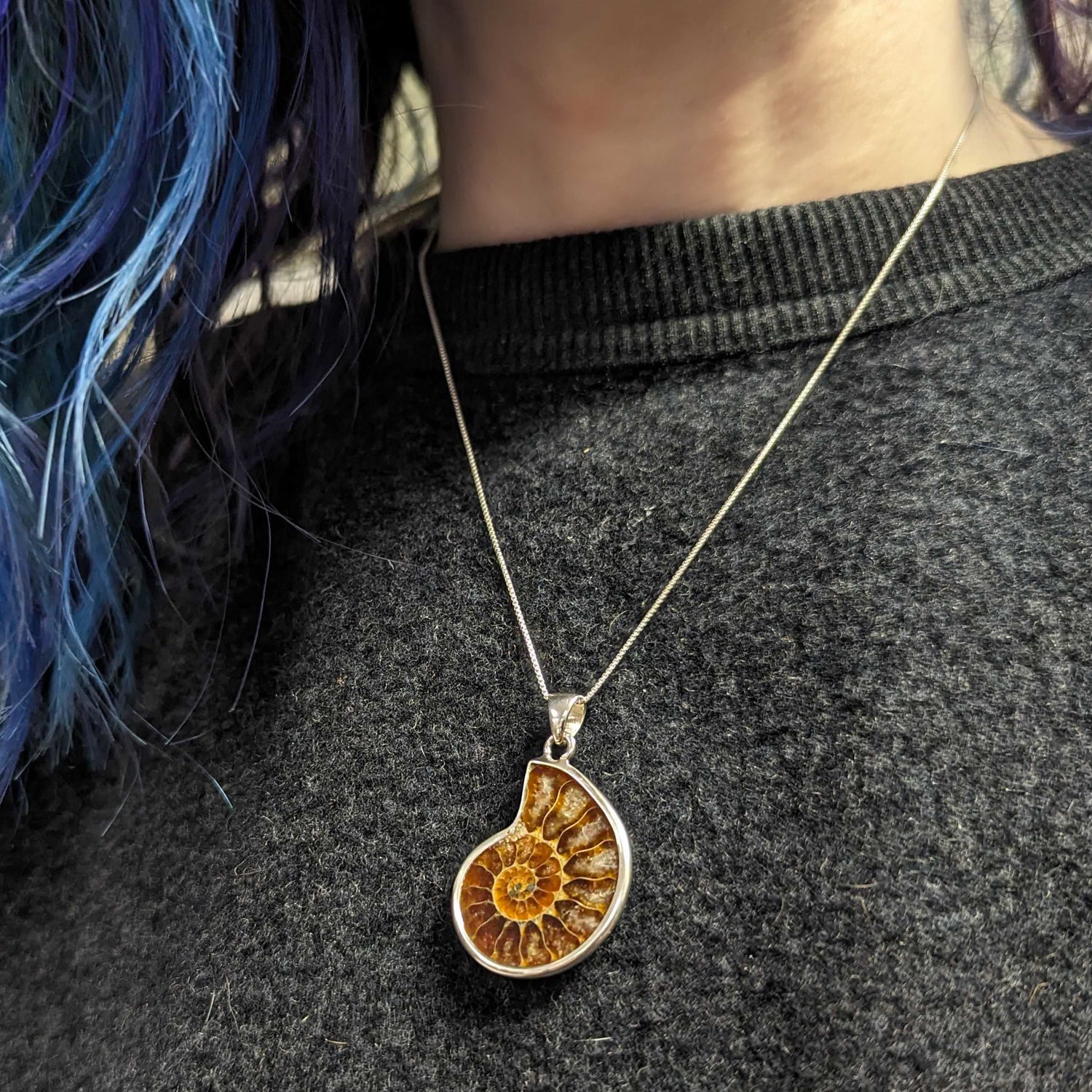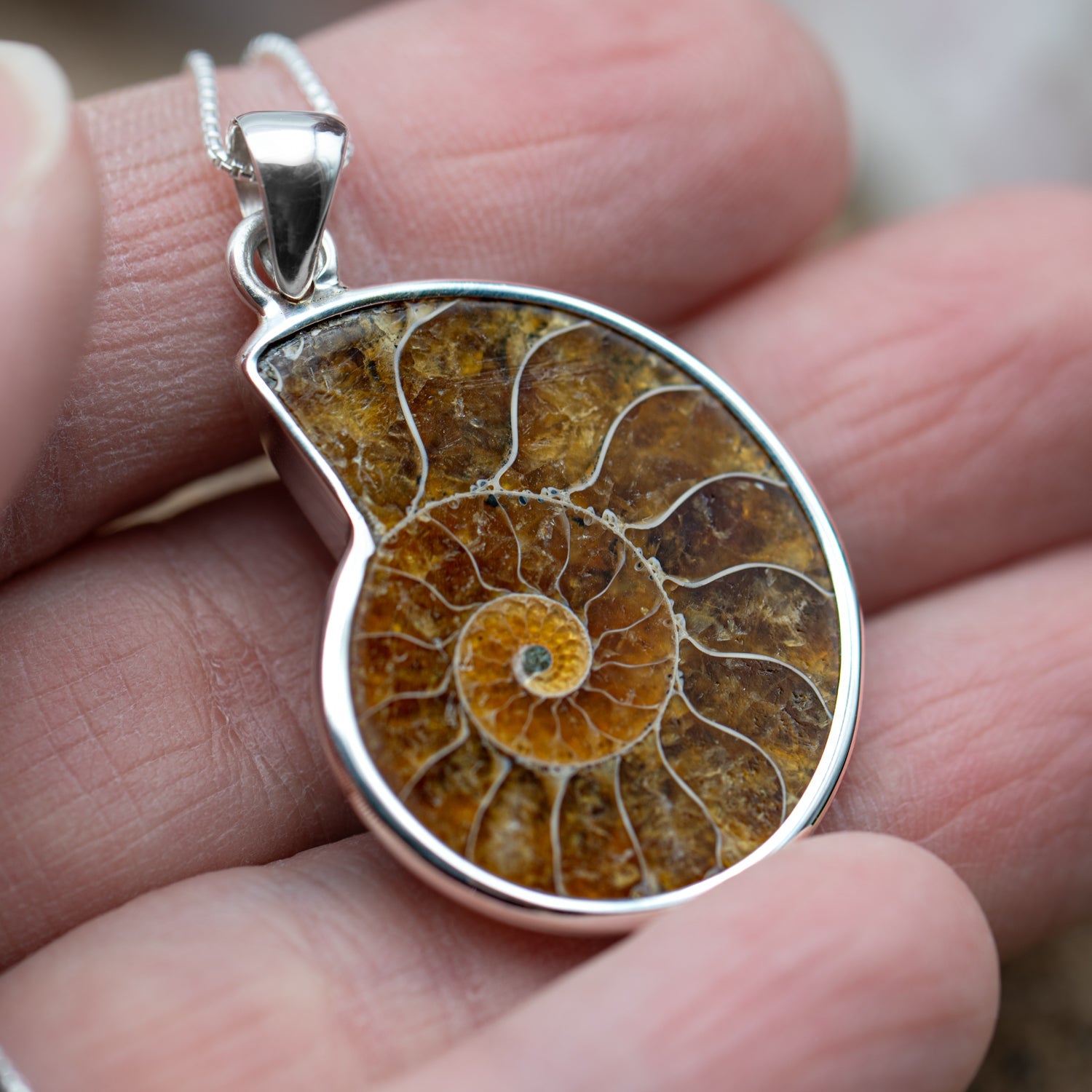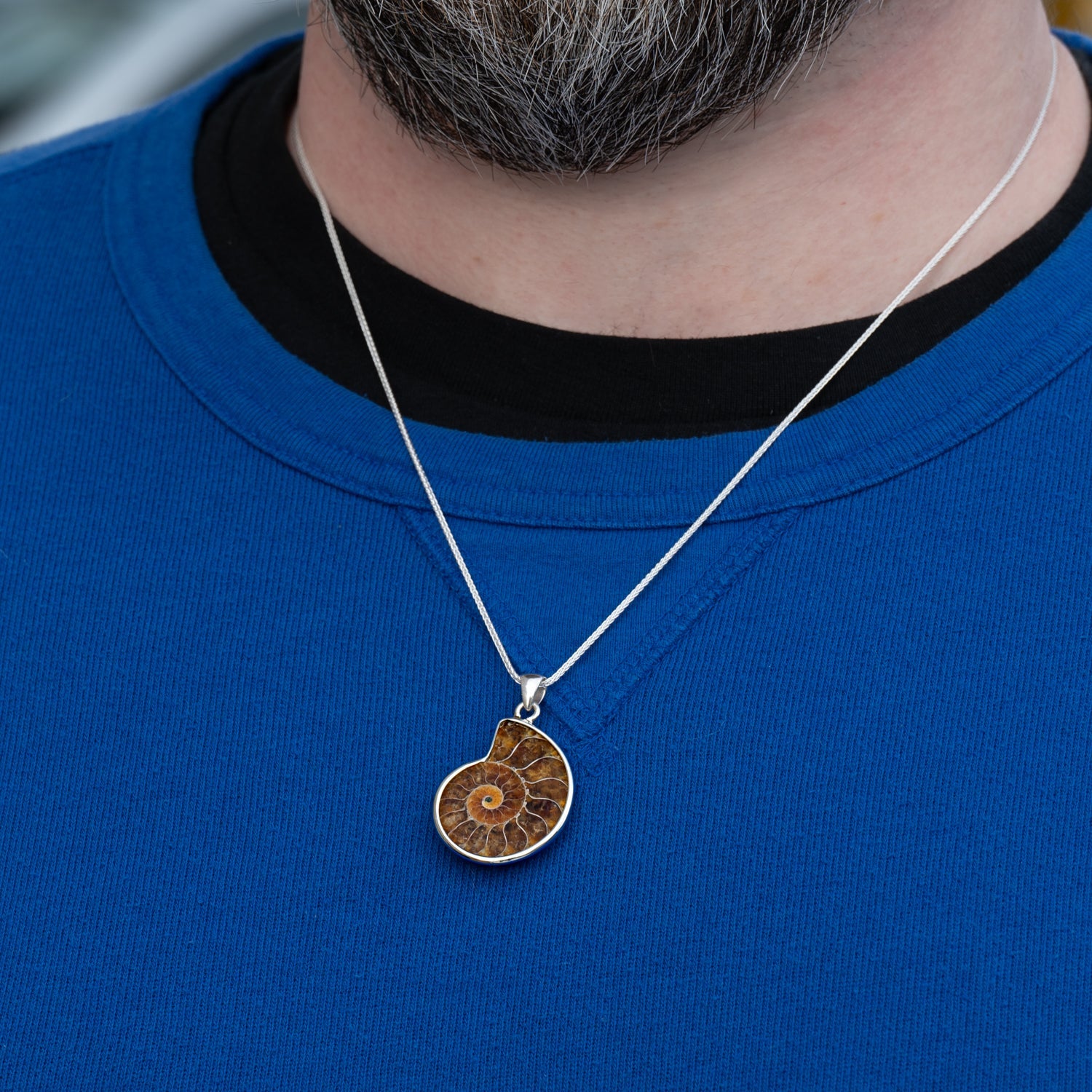 - The Ammonite pendant necklace features one-half of a polished, bisected ammonite fossil, approximately 1/2 to 1-inch (~1.5 to 2.5cm) wide. The ammonite is displayed in a custom-made, sterling silver bezel which is strung on a box-style chain. The chain measures 18-inches (~45cm) and is also made of sterling silver. The complete necklace comes in a decorative box and includes a small information card about the specimen.