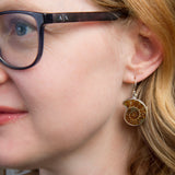 - The Ammonite earrings feature a bisected pair of ammonite fossils, approximately 1/2 to 3/4-inch (~1.5 to 2cm) wide. As with the pendant necklace, each ammonite fossil is held in sterling silver.
