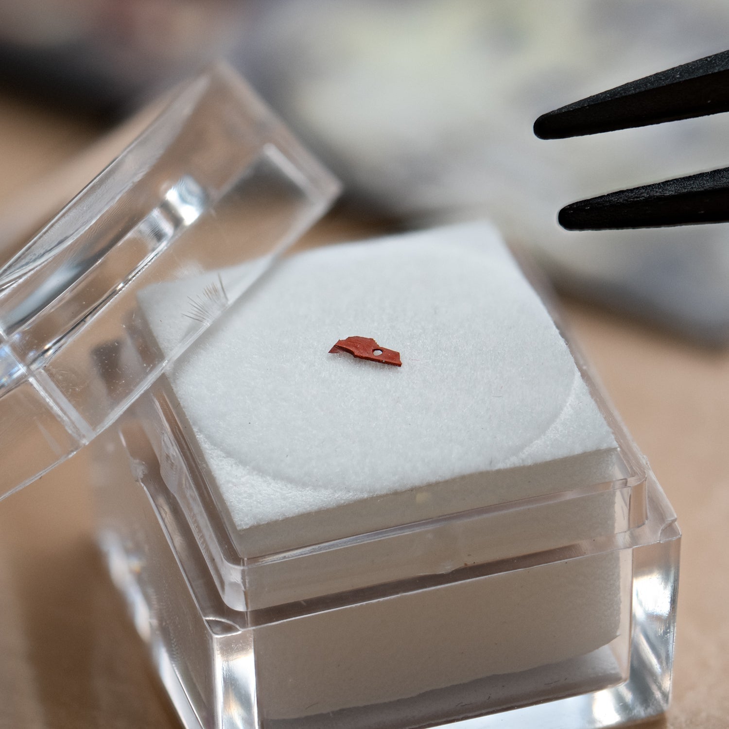 Due to the age and elastic nature of this material, specimens will vary in shape and size. The approximate surface area measures 1-2mm x 2-5mm.