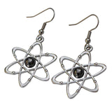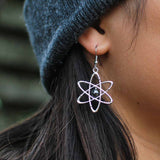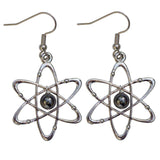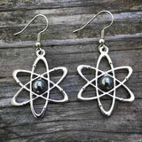 These carbon atom earrings make a delightful statement in support of science. A dark grey Swarovski pearl on a hand-wrapped silver wire makes the nucleus, and the 1 1/4" atoms are hung from stainless steel french hooks. From t-shirts to formal dresses, these earrings will add that extra "Hooray, science!" touch in the very best way.