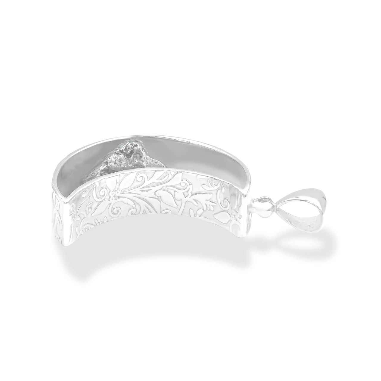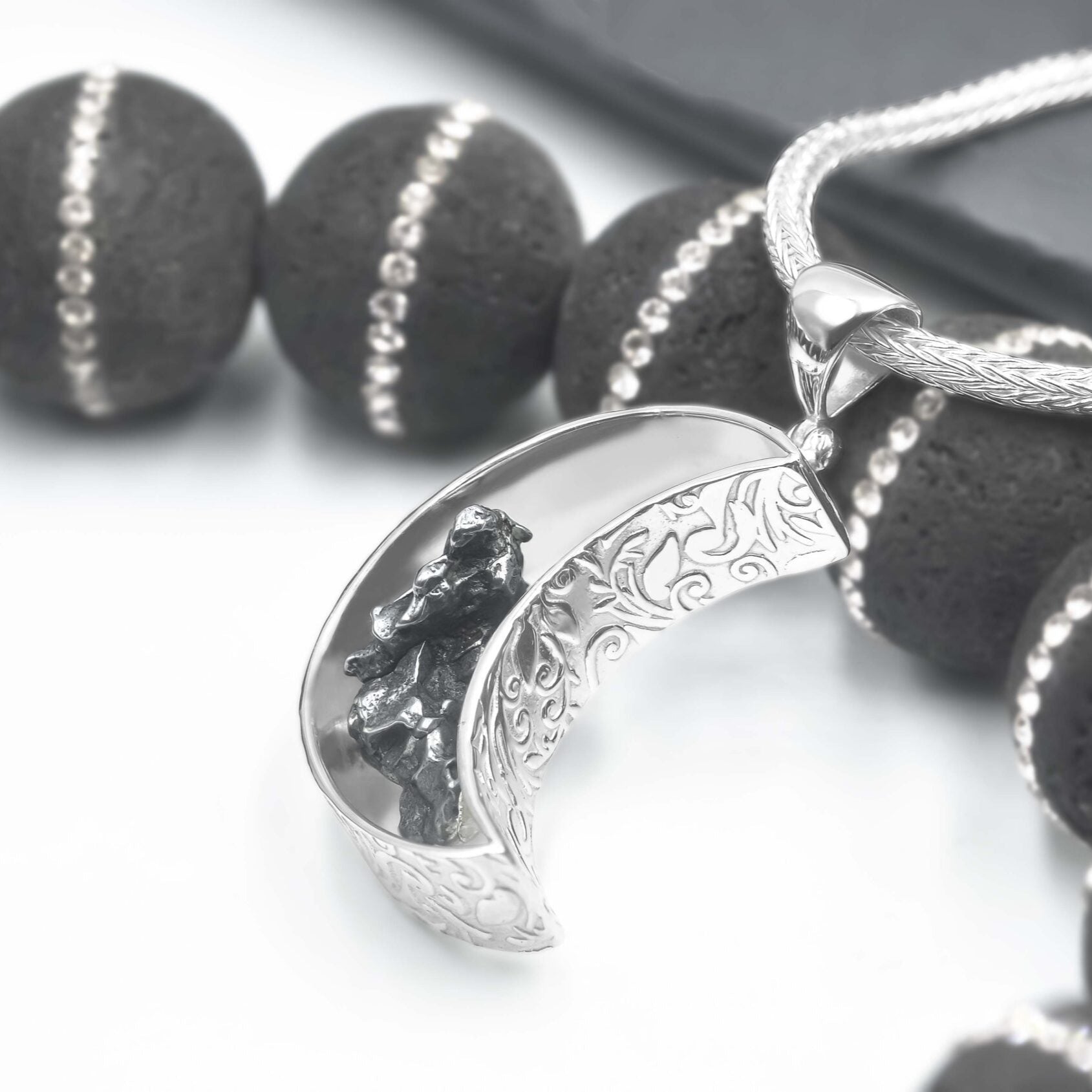 - Genuine Campo del Cielo Meteorite in Fine Sterling Silver Pendant, with Floral pattern textured in the outside of Crescent Moon design.