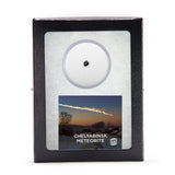 This specimen is a Chelyabinsk meteorite fragment. The specimen is housed in an acrylic jar that is encased within a glass-topped riker display box. The box measures 4 1/2" x 3 1/2". A small information card is also included, which serves as the certificate of authenticity.