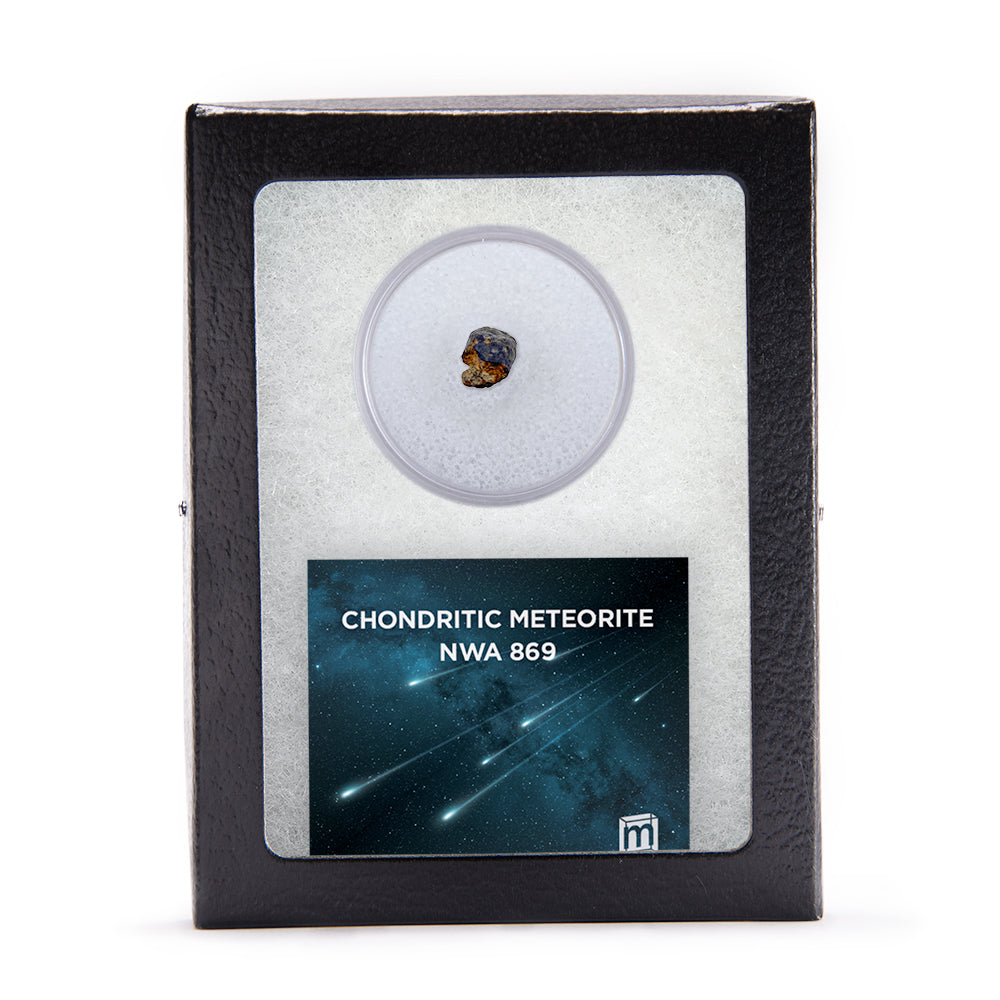This specimen is a complete chondritic meteorite, specifically meteorite NWA 869. NWA 869 was discovered in Northwest Africa in 2000. Over two metric tons of material from this meteorite have been found so far, with sizes ranging from pebble-sized to enormous chunks weighing more than 40 pounds.