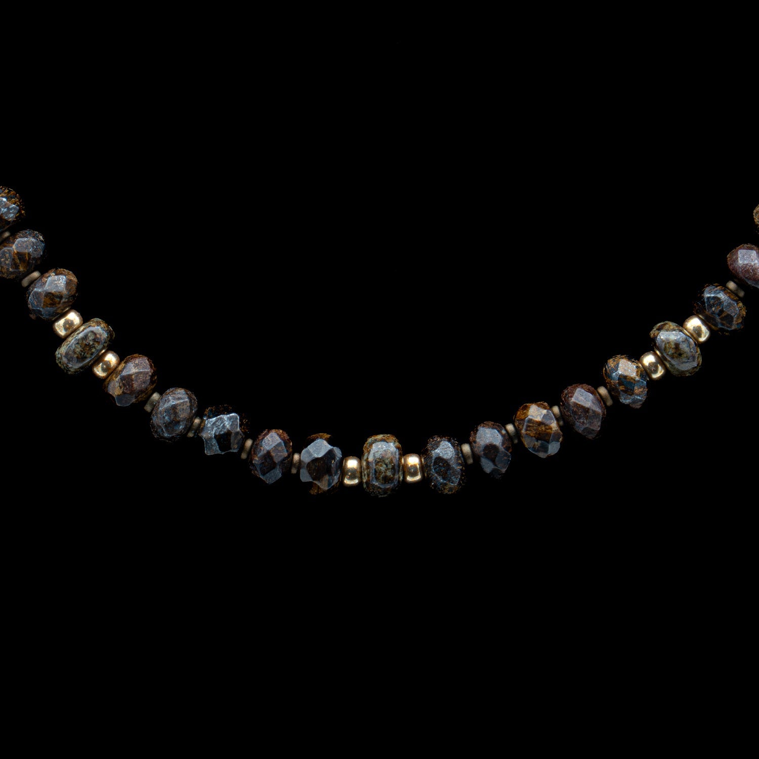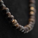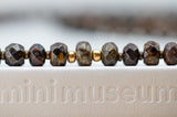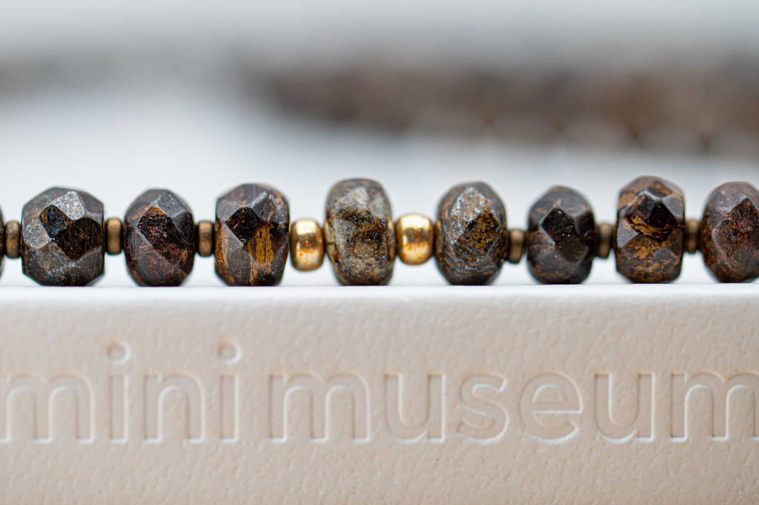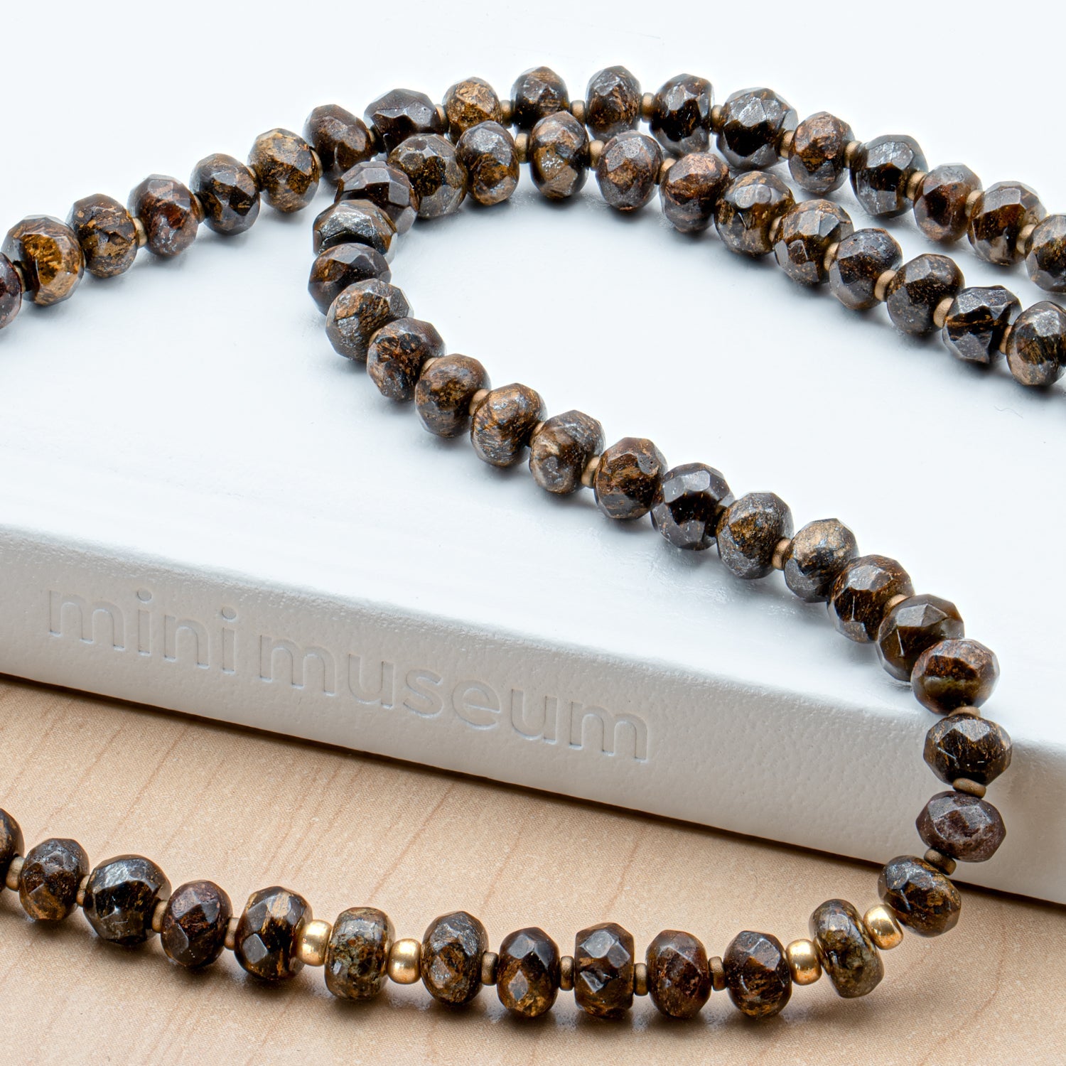 This necklace, made right at Mini Museum contains three meteorite beads made with material from Chondritic Meteorite NWA 869, an ancient meteorite that dates back over 4,500,000,000 years.