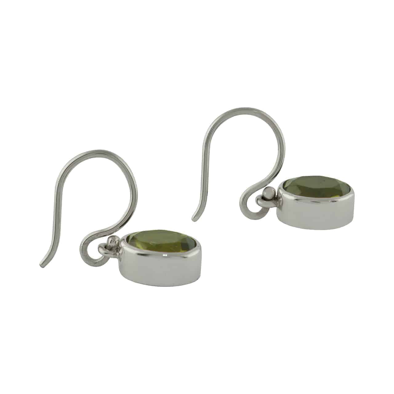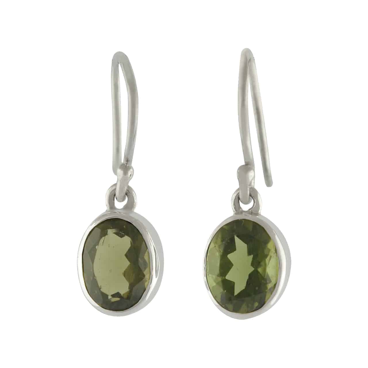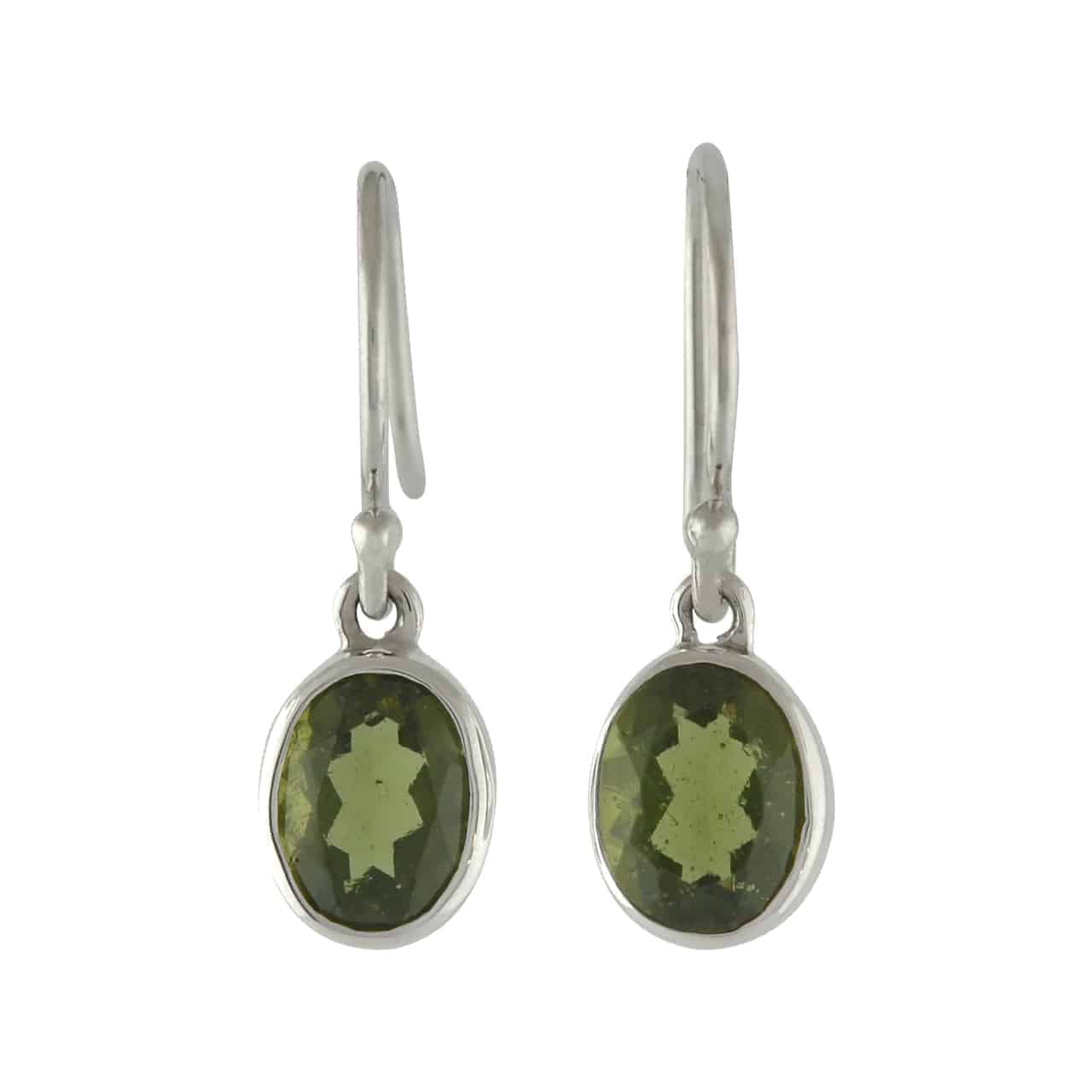 - These high-quality earrings feature beautifully faceted Moldavite, selected for their clarity and depth of color, skillfully bezel set in Sterling Silver with our simple yet elegant French ear hook.