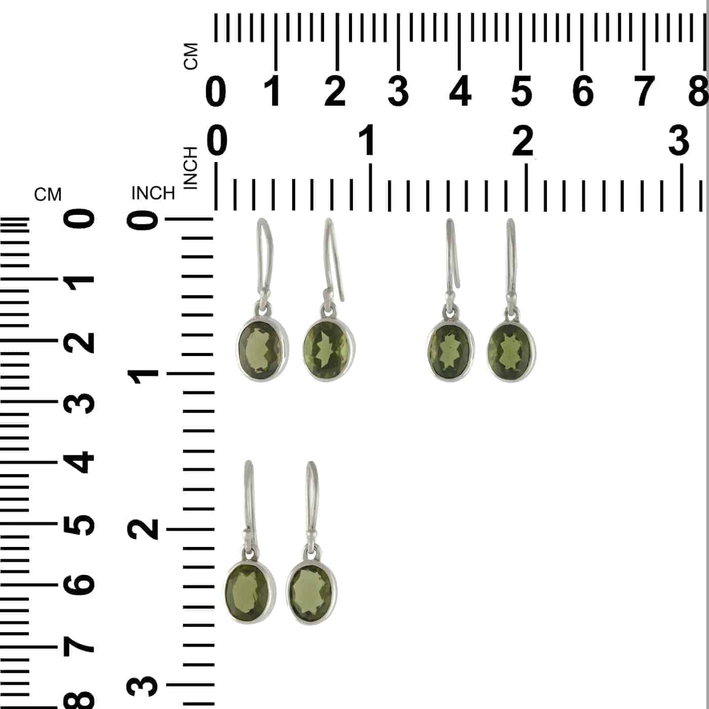 - Each faceted Moldavite gem is approx. 9 x 7 mm (2 carats) in size. Overall length including hook is approx. 1” long by .25” wide.