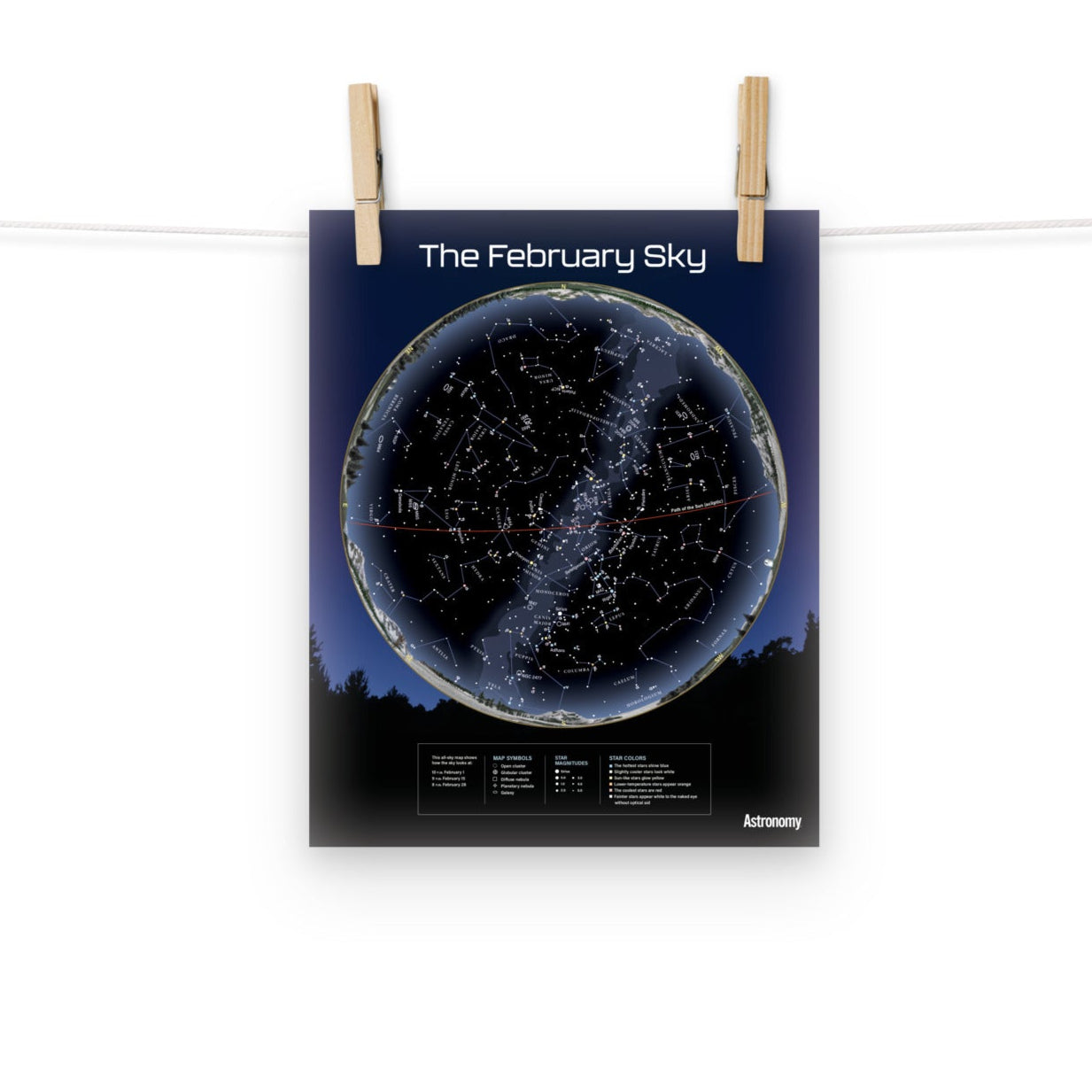 This map portrays the sky as seen near 35° north latitude during the month of February.