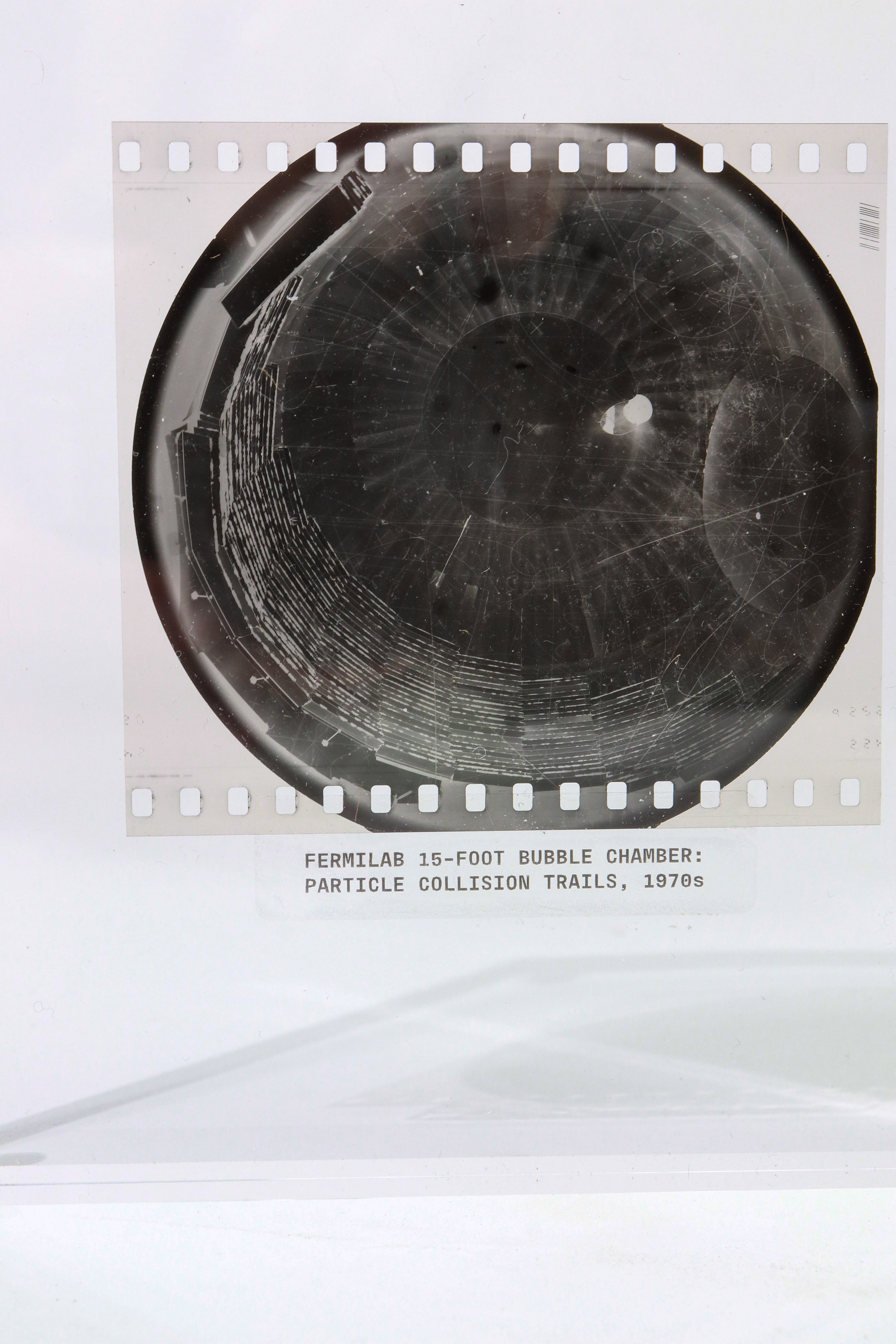 This frame of photographic film captures a rare glimpse of exotic subatomic processes that were unleashed within Fermilab’s legendary 15-Foot Bubble Chamber.