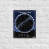 This poster features a map of the January sky. This map portrays the sky as seen near 35° north latitude.