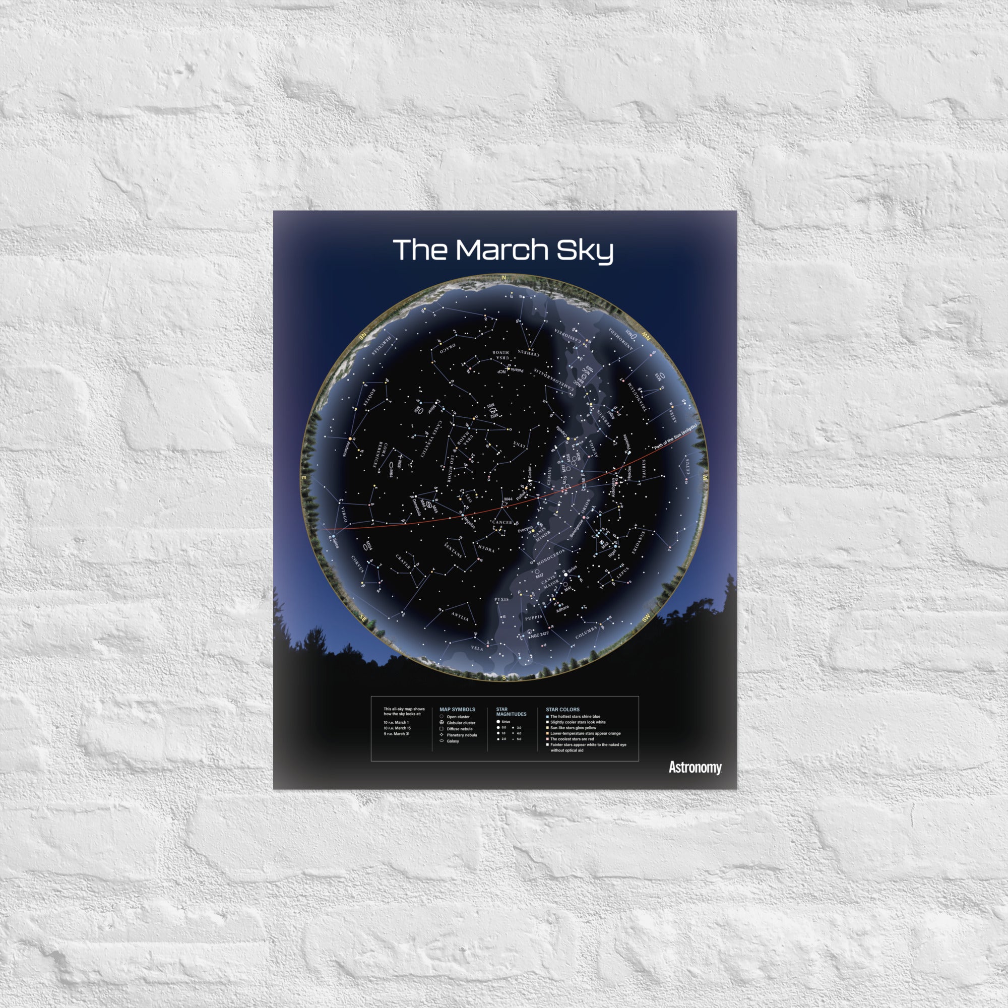 This poster features a map of the March sky. This map portrays the sky as seen near 35° north latitude.