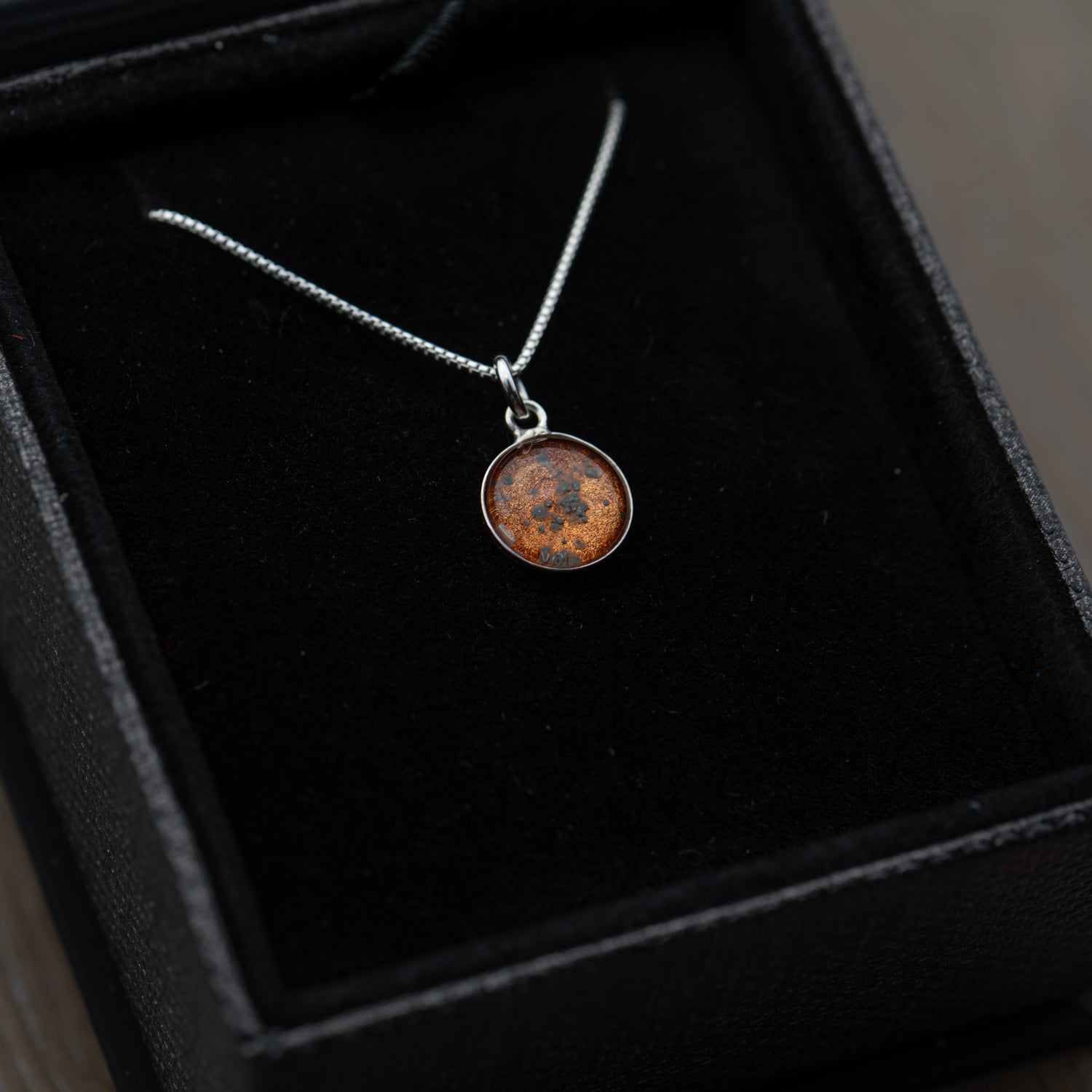 This Martian Meteorite Pendant is an acrylic disk that contains Martian surface material. It comes from the shergottite meteorite Amgala 001 which was discovered in 2022.