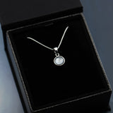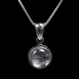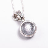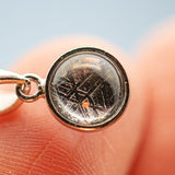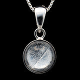 This necklace features a fragment of the Muonionalusta meteorite set inside a glass sphere. Each sphere measures approximately 9-10 mm in diameter (0.35-0.39 inches) and allows for viewing of the meteorite from either side.