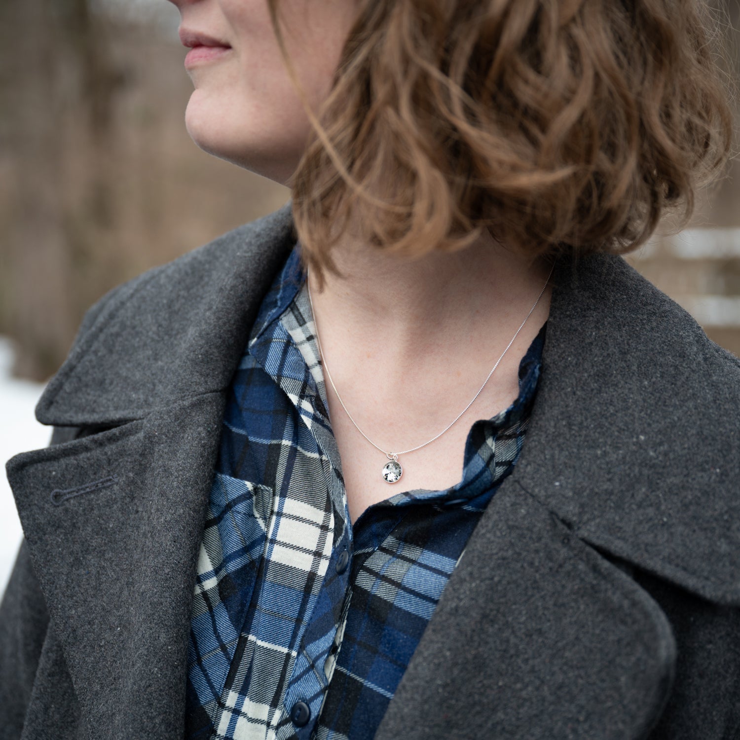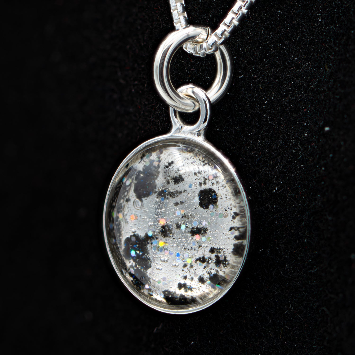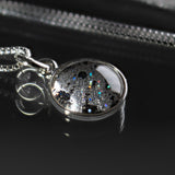 This exclusive item is crafted at the Mini Museum workshop with a crystal-clear glass top, sterling silver backing, and an 18" chain. It's an incredible piece of astronomic jewelry made with rare and ancient meteoritic material!