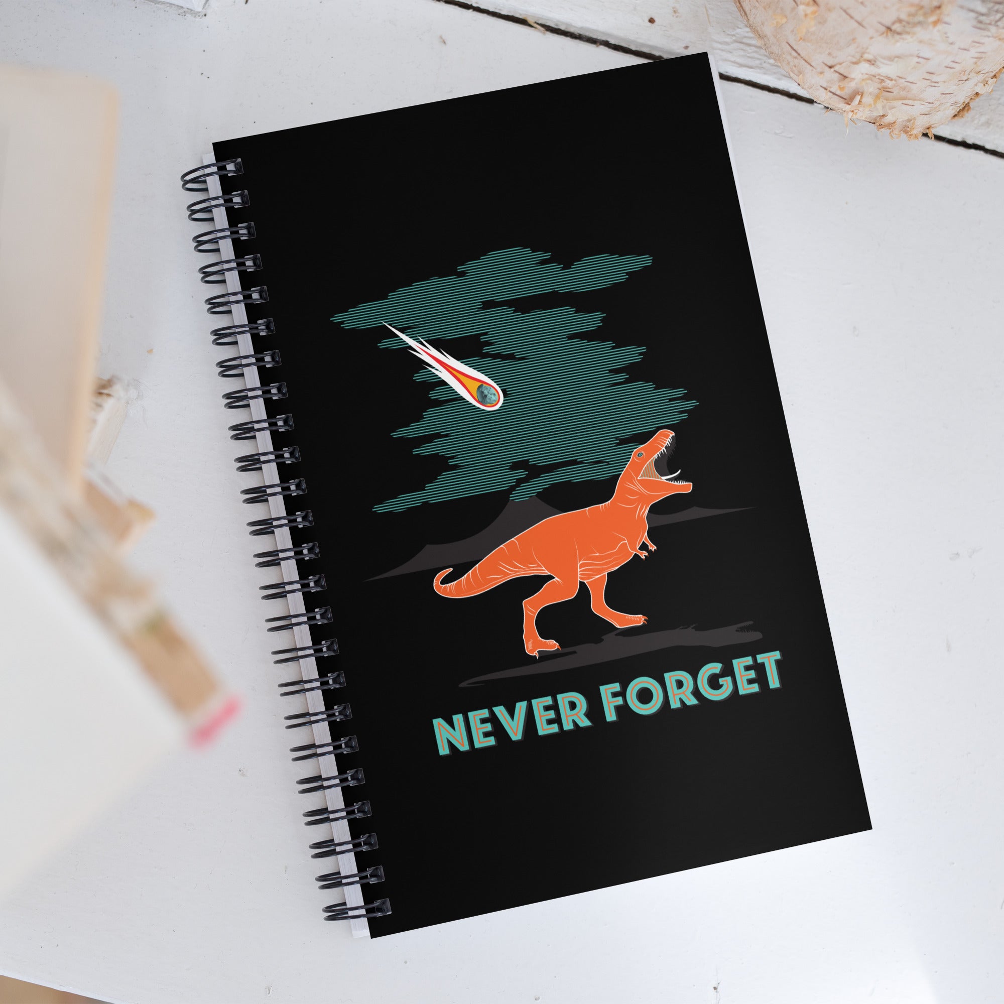 This notebook features the mighty t-rex and the infamous asteroid in vibrant colors. You'll never forget what happened to the dinosaurs!