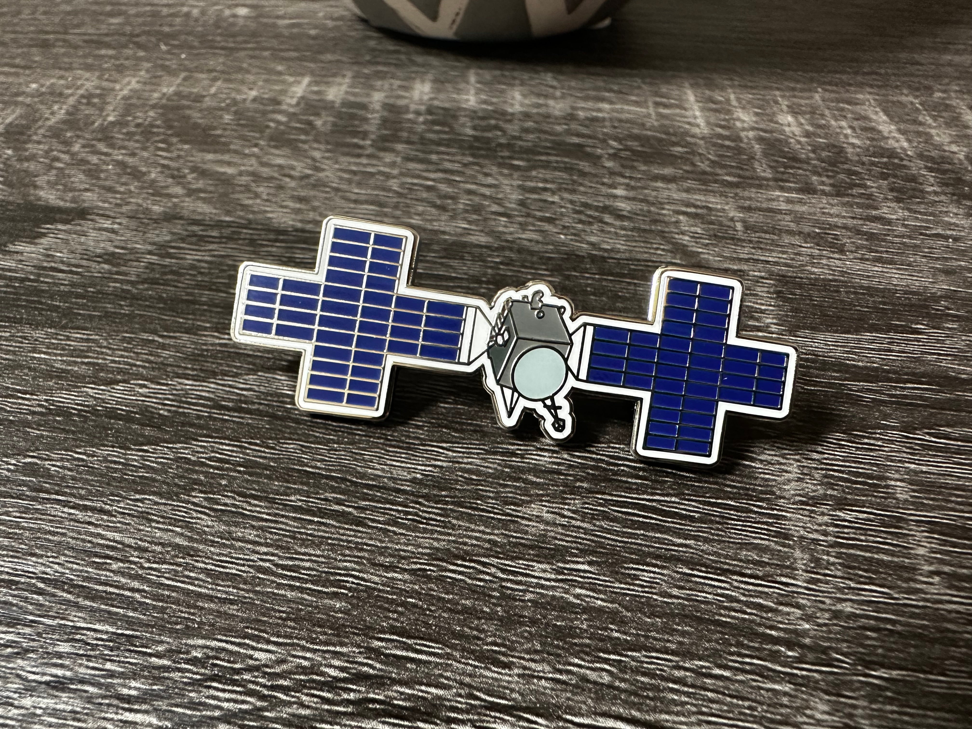 The Psyche spacecraft enamel pin! A beautiful representation of the Psyche spacecraft which will be travelling to explore 16 Psyche, a giant metal asteroid located in the main asteroid belt, which is about three times farther away from the sun than Earth.