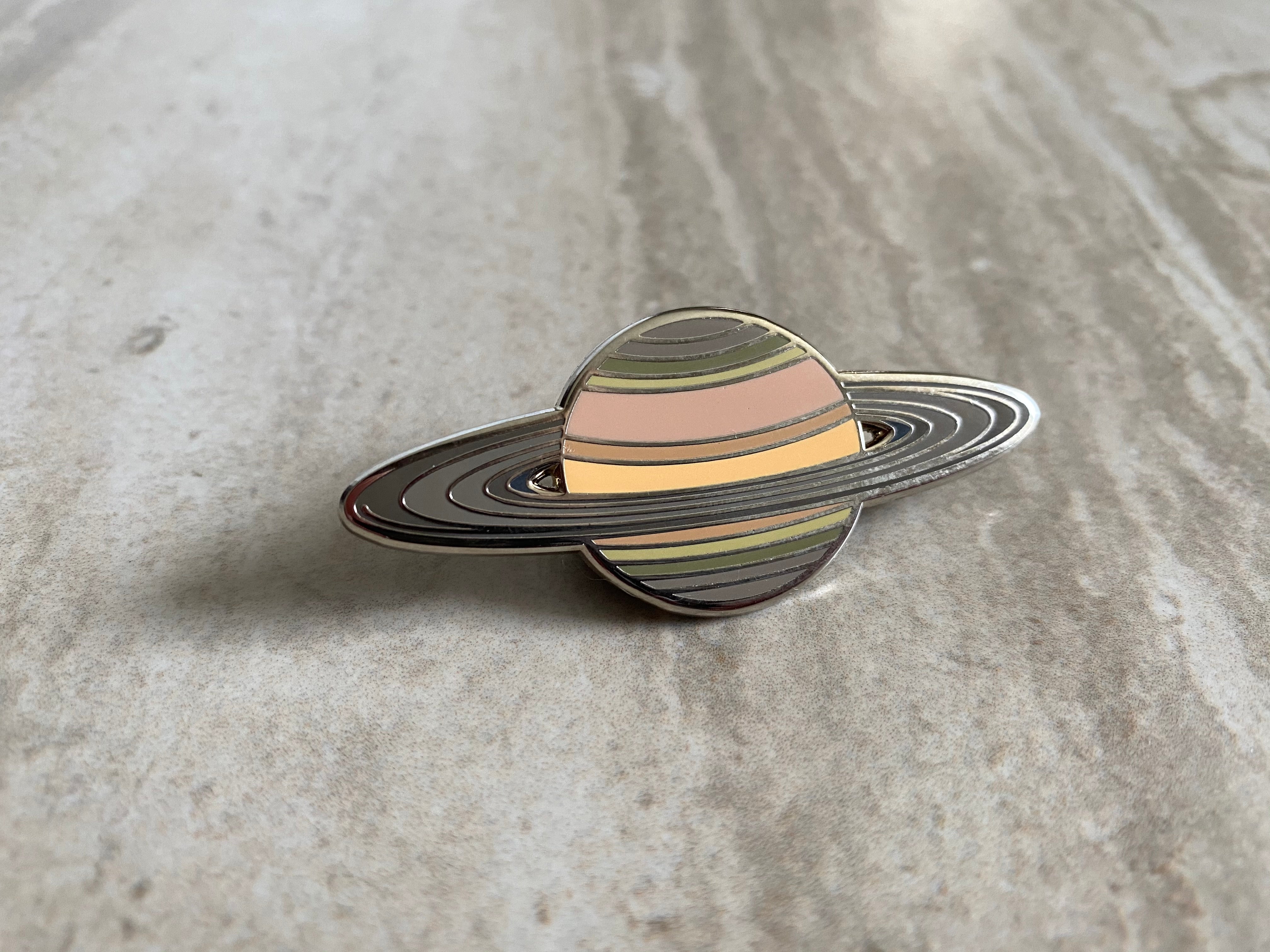 Saturn, the iconic gas giant with its beautiful rings is showcased with this 2" hard enamel pin; The 6th planet from the sun, the second largest in the solar system and comprised mainly of hydrogen and helium! Saturn has at least 53 moons, with a potential 29 more awaiting confirmation. This pin is part of our planet series of hard enamel pins.